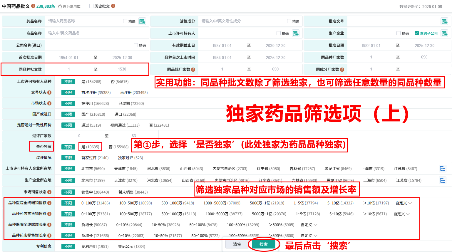 摩熵医药的中国药品批文数据库结合了国内所有药品生产批准信息、药品治疗领域分类、医保药物信息、国家基本药物目录、国家非处方药目录、中药保护品种、药品所属公司信息等一系列相关属性信息。可一键筛选出全部的独家药品品种,应用非常简单,登录其数据库,勾选‘是否独家’,即可筛选出全部的独家药品品种。