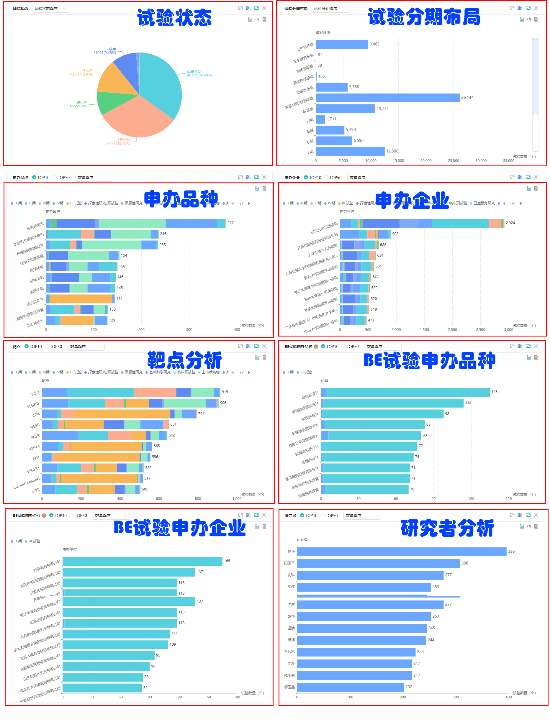▲该数据库提供了更多维度的信息查询、条件筛选及分析下载功能,如条件筛选有剂型、给药途径、数据来源、试验范围、联合用药、试验状态、试验分期、药品类型、试验分类、试验设计、一致性评价、申办单位所在地、试验机构所在地、ATC分类等选项;信息查询有试验题目、登记号、药品名称、靶点、试验日期、适应症、申办单位(含子公司)、临床机构、研究者、对照要、试验药、公示日期等搜索栏;分析方面提供了全局可视化与下载功能,能按照登记号、品种、单位、临床机构多种维度进行浏览分析与下载。