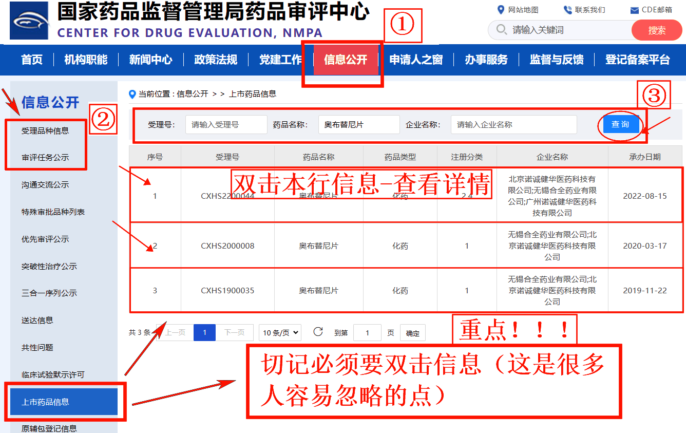 查询步骤:登录CDE官网首页→点击"信息公开"→选择"受理品种信息"或"审评任务公示"
