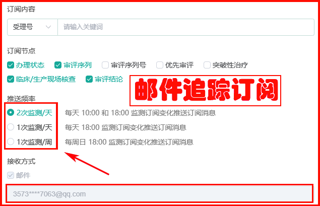 重点目标药品需要跟踪监测其审评进度变化,只需开通邮件订阅功能接收消息提醒即可。订阅时需勾选关注的审评节点及推送频率,并填写接收邮箱地址即可完成设置。
