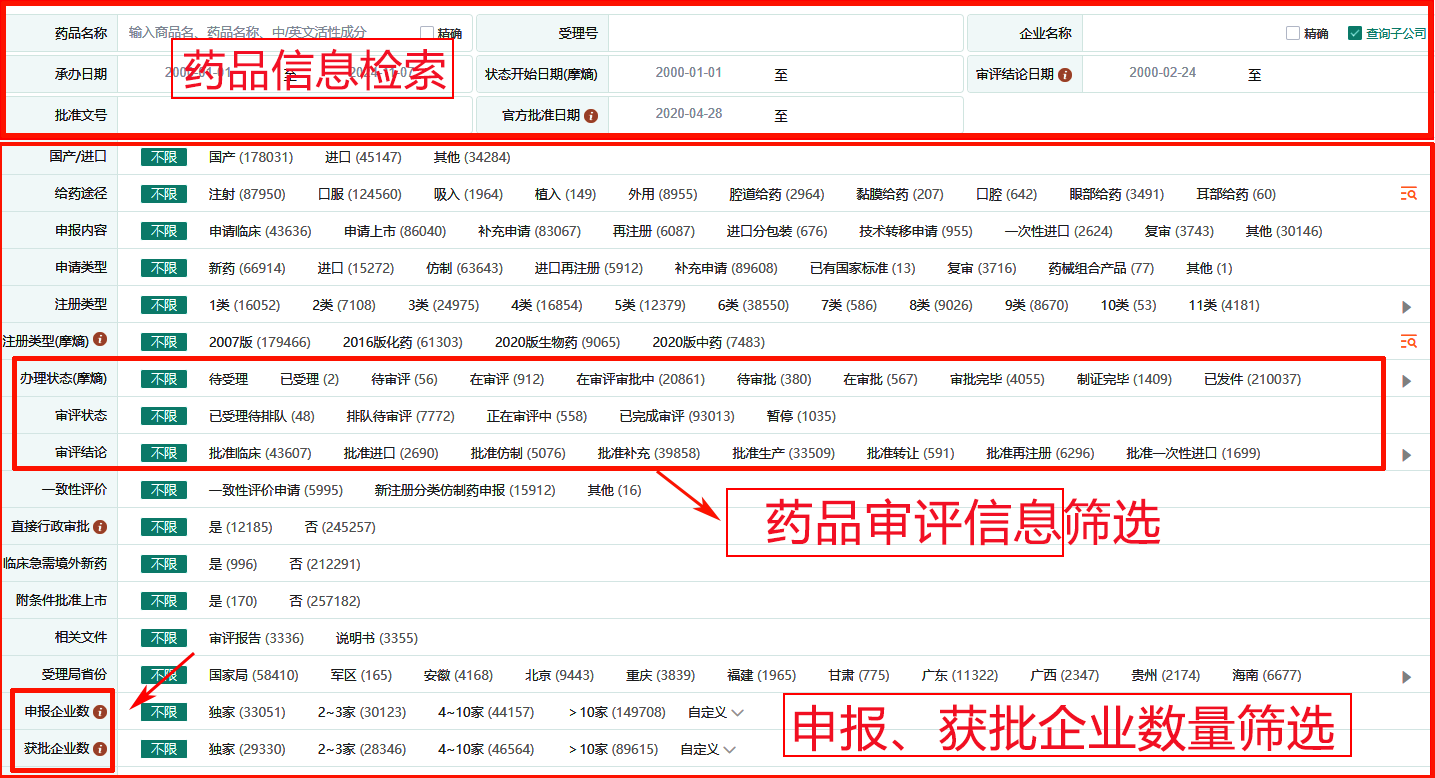 功能理解:以业内常用的(摩熵医药)中国药品审评数据库举例,这个数据库是综合国家药监局与药审中心等多个部门的多个官方数据库整合而成,收录了药品审评中心公布的全部受理号及其办理状态,包括国内新药注册申报、补充申请、进口等情况,同时收录了优先审评、突破性治疗等特殊审评品种,并经过系统整理,深度加工,可以了解潜在竞争产品及其目前状况,预测竞品上市时间,提供决策支持。 本数据库支持多类型、多角度检索,查询方式灵活,可供分析查询的维度包括申报药品名称、申报企业、申报类型、注册分类、治疗领域、审评审批状态、审评序列与序号、审评结论及相应的变化时间等多种检索方式,并能快速筛选出优先审评、重大专项、特殊审评品种及一致性评价品种等。另外在结果中增加的审评时间轴功能包含了各个主要审评状态的统计信息,直观呈现目标药品的审评进度。