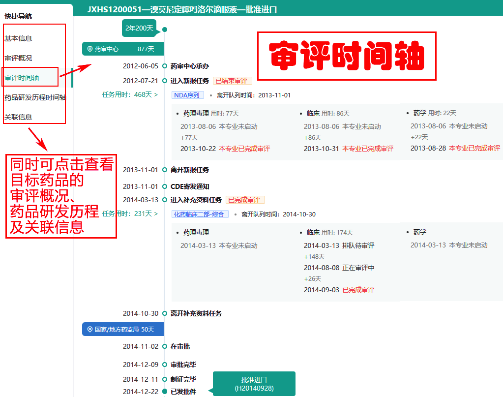 在上图审评时间轴界面中,我们可清晰查看承办日期、NDA排队序列状态、离开队列时间、药理毒理审评耗时、临床审评耗时、药学审评耗时、CDE寄发通知时间、补充资料任务时间、药监局审批完毕时间、制证时间及批准发件时间等全流程关键节点信息。