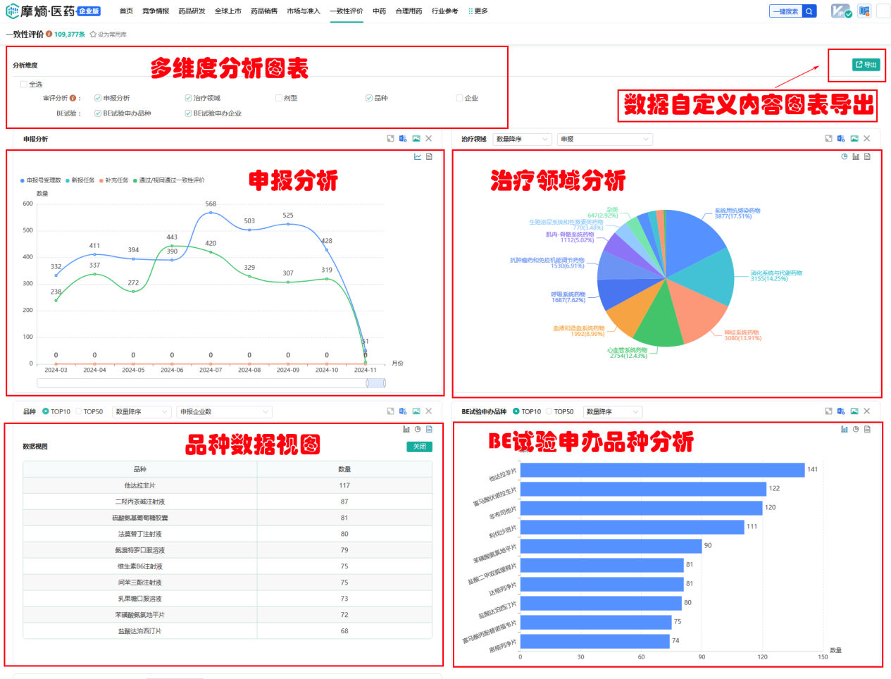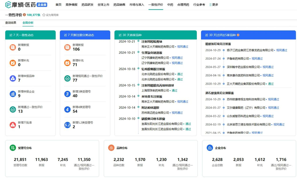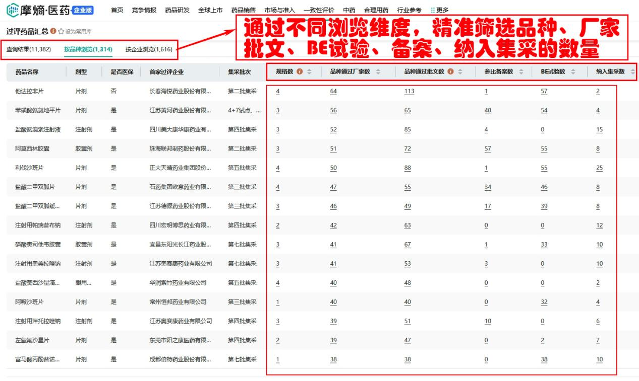 在摩熵医药一致性评价数据库的结果页面中可按品种浏览、品规浏览、企业浏览、项目进度等维度进行展示;可视化分析可按申报分析、治疗领域、剂型、品种、企业、BE试验申办品种、BE试验申办企业及全局动态面板等维度进行展示。