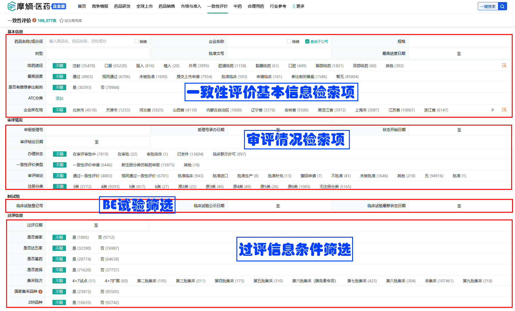 在摩熵医药一致性评价数据库的搜索页面中可按如下字段进行筛选与查询