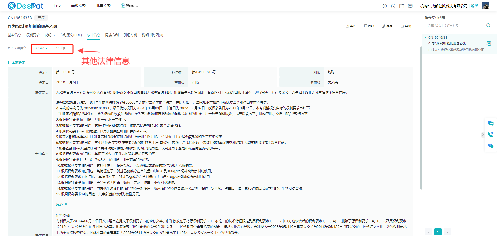 该数据库不仅提供基础法律信息,还包含不限于初审、复审、无效宣告、诉讼信息、许可记录、转让详情、海关备案、质押情况、保全措施、部分无效宣告、行政裁决的公开信息、官方文件系统、专利期限调整(涵盖PTA、PTE及儿科用药的调整)、判例数据、口头审理记录、中国的专利补偿数据以及与PCT(专利合作条约)相关的信息等。