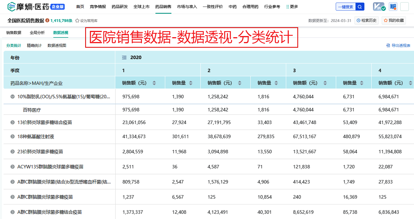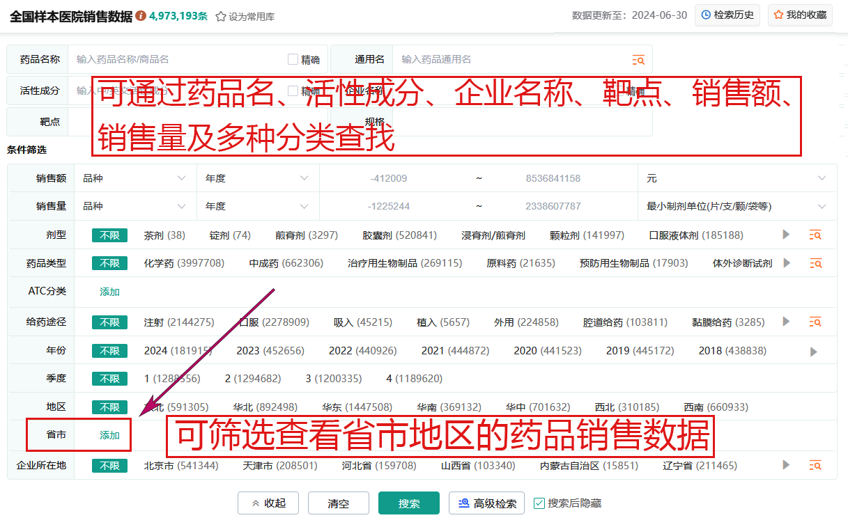 摩熵医药-全国医院销售全终端数据库采集了近2300家来自不同省市的二级以上医院的数据(包括至少100张床位的医院,其中1796家为综合医院和474家为专科医院),同时涵盖了1550多家一级和未定级医院、4100多家社区卫生服务中心以及6550多家乡镇卫生院。依据医院数量、床位规模、医院分类、地区疾病特点和当地医疗条件等因素,利用专业的计算模型进行分层放大,数据库覆盖了超过10000家二级以上医院(床位数不少于100张)、约12000家一级医院、约10000家未定级医院以及约98000家基层医疗卫生机构(主要包括社区卫生服务中心和乡镇卫生院)。包括化学药品、生物药品以及中成药。其中,化学药品和生物药品覆盖14个大类、90个子类,包含5000多种通用名药品;中成药则包含13个大类,超过6000种通用名药品。查询功能丰富,大家可以根据药品名称、生产企业、ATC编码、剂型、给药途径、年份等多个条件进行筛选。分析功能包括年度和季度销售趋势、企业市场表现、药品种类销售情况、剂型销售分布、规格销售情况、给药途径销售分布等,同时提供直观的可视化图表和原始数据的展示及下载功能。