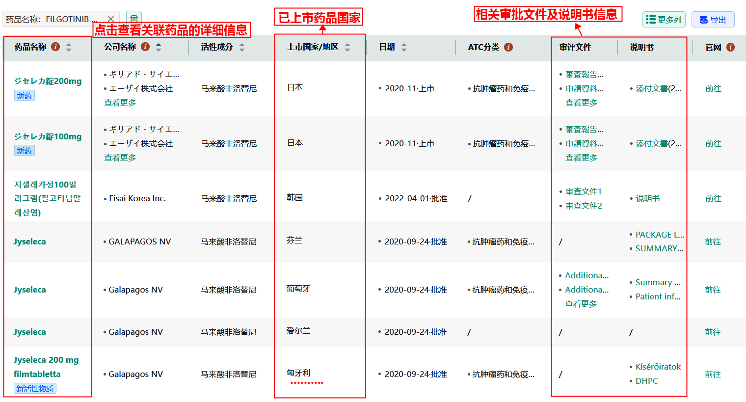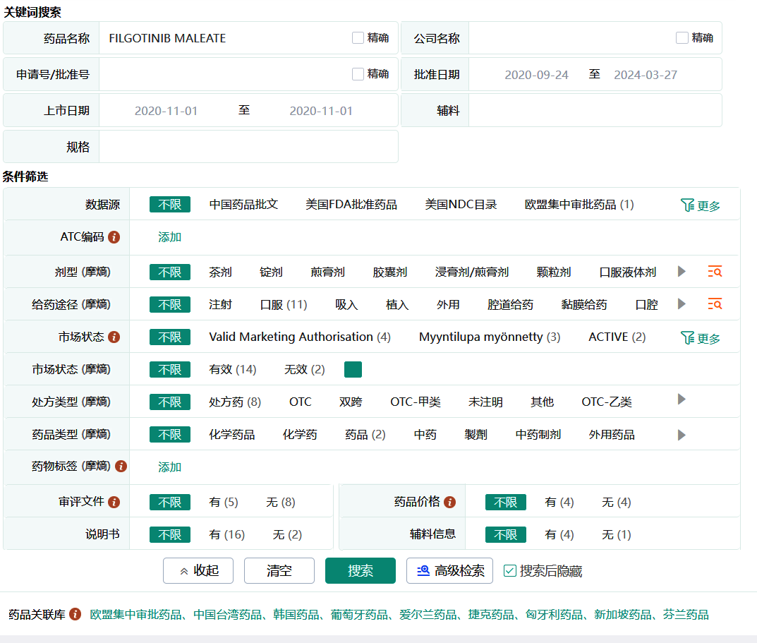 以搜索活性成分’FILGOTINIB MALEATE’为例,如上图搜索筛选页面,可以看到该活性成分在欧盟集中审批药品、中国台湾药品、韩国药品、葡萄牙药品、爱尔兰药品、捷克药品、匈牙利药品、新加坡药品、芬兰药品中均有上市关联,点击可查阅目标国家的详细信息,且在下方列表页中也有展示,同样可以点击查看相关联的药品信息、审评审查文件、说明书信息及官网链接。当然,对于研究员来说也可以通过药品的公司名称、批准号、批准日期、辅料、规格、数据源、ATC编码、剂型、给药途径、市场状态、处方类型、药品类型、药物标签、审批文件、说明书、药品价格、辅料信息等条件进行检索。