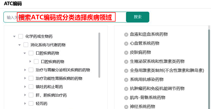 与上面(场景一)一样,首先进入该数据库,然后在上图(全球上市药品数据库-搜索筛选页面)中点击【ATC编码】,如下图,可搜索ATC编码或选择目标疾病领域,即可筛选出目标疾病领域在全球各国的上市药品,搜索结果如图(全球上市药品数据库-搜索结果列表页面)中,可以自定义下载目标药品信息。
