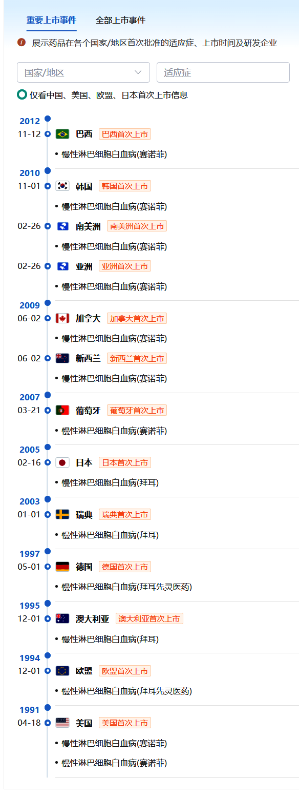 此外,点击药品名称除了查看药品详细信息还可以查看关联的化学结构、研发企业、研发状态、专利文献、临床试验、审批历程、销售价格、交易、医保、集采、全球上市批准等全管线信息,如点击上图(全球药物研发数据库)中的‘氟达拉滨’可以看到该药品在全球各国的上市历程图。