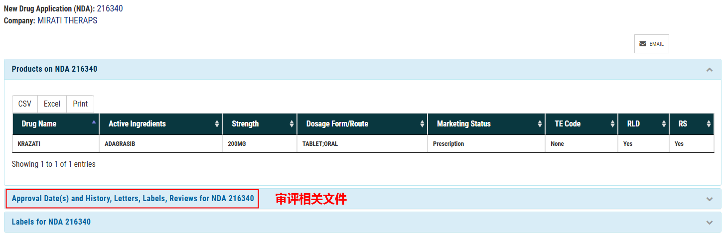 进入FDA药品数据库(Drugs@FDA)-->搜索框搜索‘krazati’