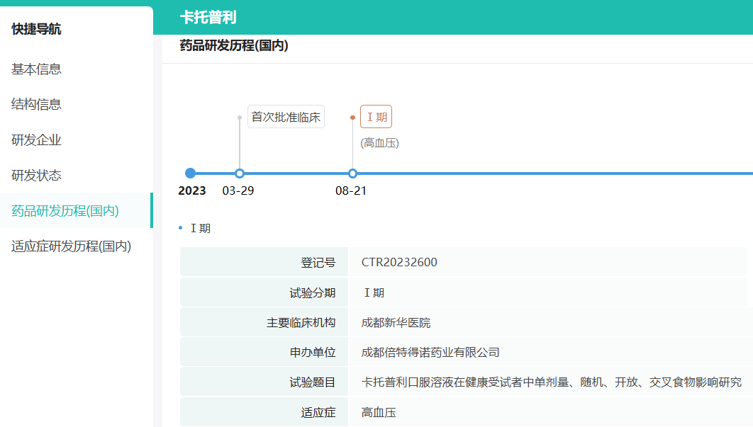 点击绿色药品名称‘卡托普利’,即可查看该新药的基本信息、结构信息、研发企业、研发状态、适应症在国内外的研发历程,如下图。