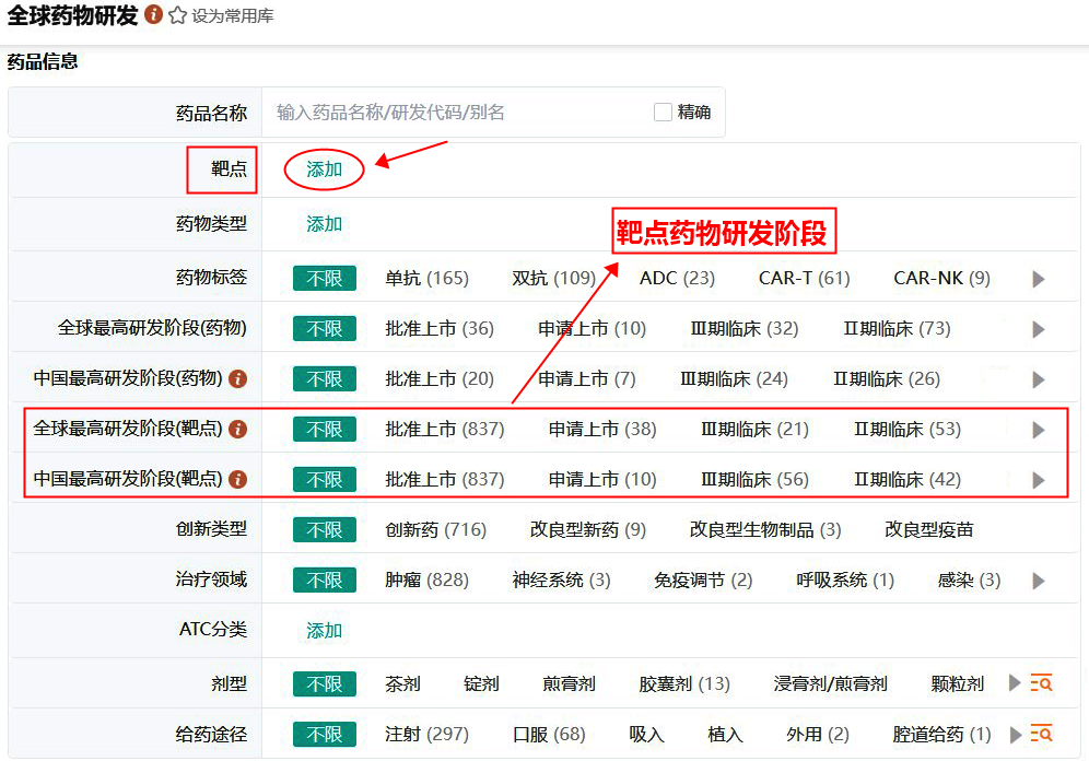 注:在[中国最高研发阶段(靶点)]中,中国最高研发阶段仅涉及中国大陆范围,不包括港澳台地区;可查询在中国尚未上市的靶点;结合“全球最高研发阶段(靶点)”查询,可查询在全球上市但在中国未上市的靶点。