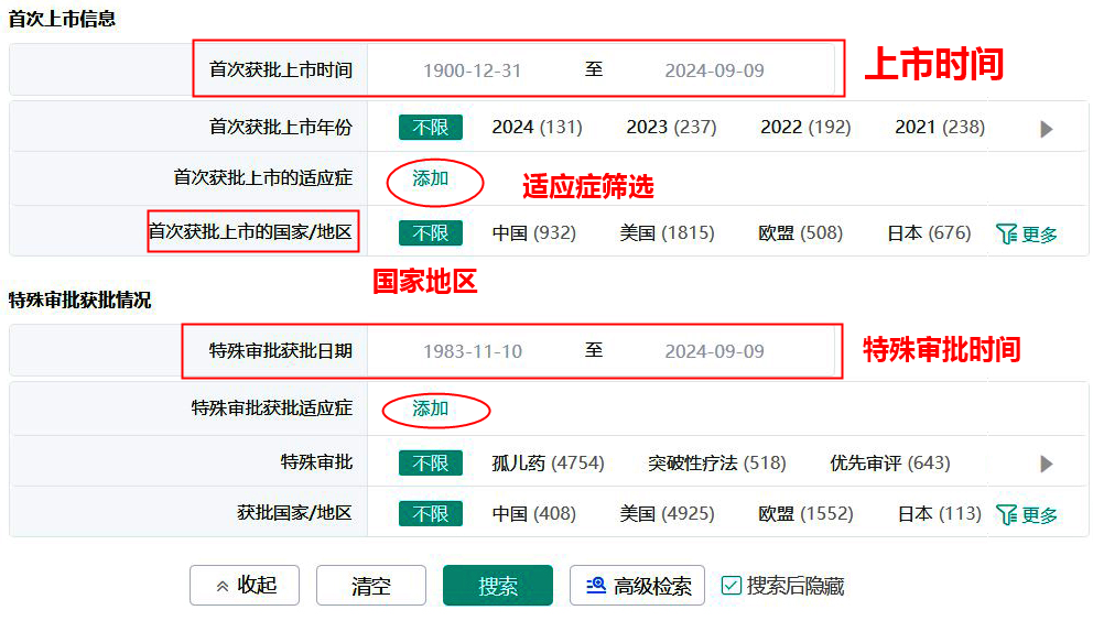 如下图,可通过[上市信息]多重筛选适应症、上市获批时间、上市国家地区、特殊审批获批情况等条件信息,点击搜索即可呈现搜索结果。