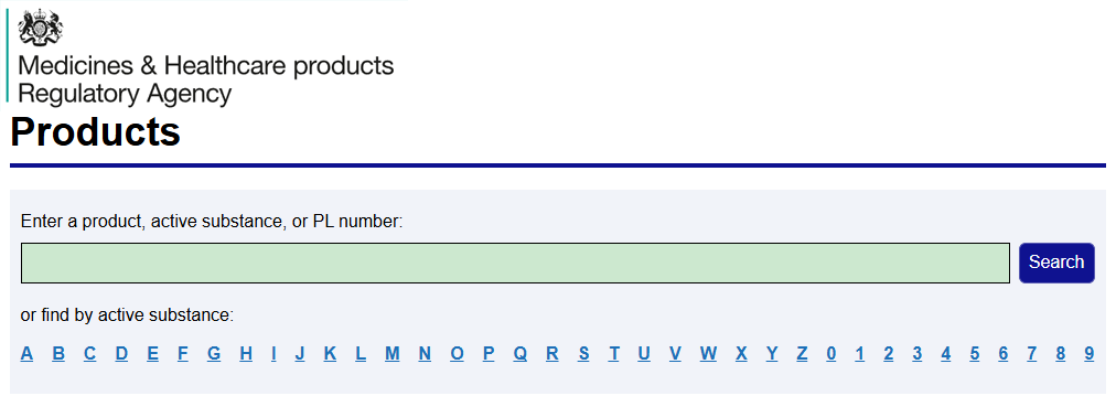英国药品与医疗保健产品监管机构(Medicines and Healthcare products Regulatory Agency,MHRA)提供了一个产品网站,允许用户查找任何单词、短语或产品许可证号码(PL)。可以通过搜索工具搜索,或者使用A-Z列表来查找药品信息。
