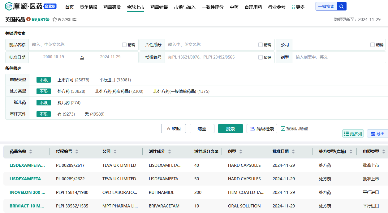 摩熵医药官提供了包含英国药品相关的各类数据库,如新药药物研发、药品临床试验、药品专利、药品上市、药品价格、药典与《马丁代尔药物大典》等数据库。可通过这些数据库查询英国药品的说明书、研发情况、上市价格、平行进口、新药批准等全部信息。