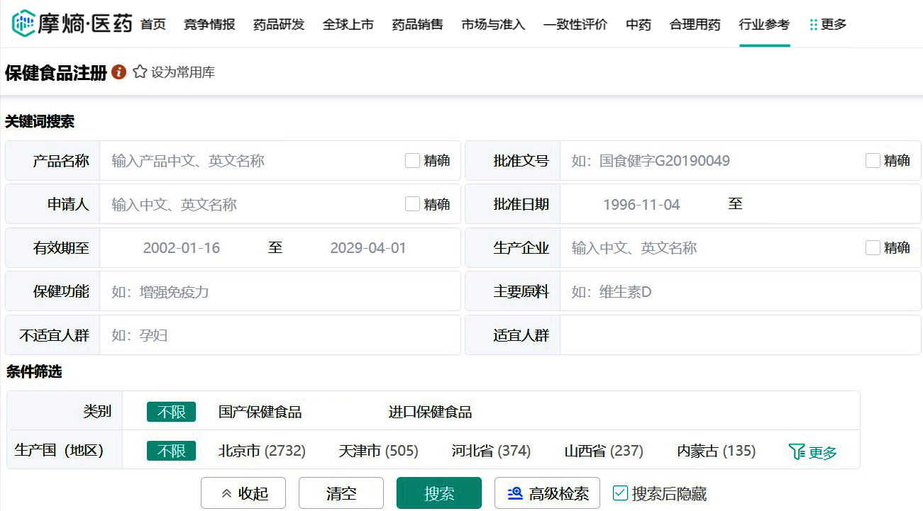 查询方法二、通过摩熵医药_保健食品注册数据库查询