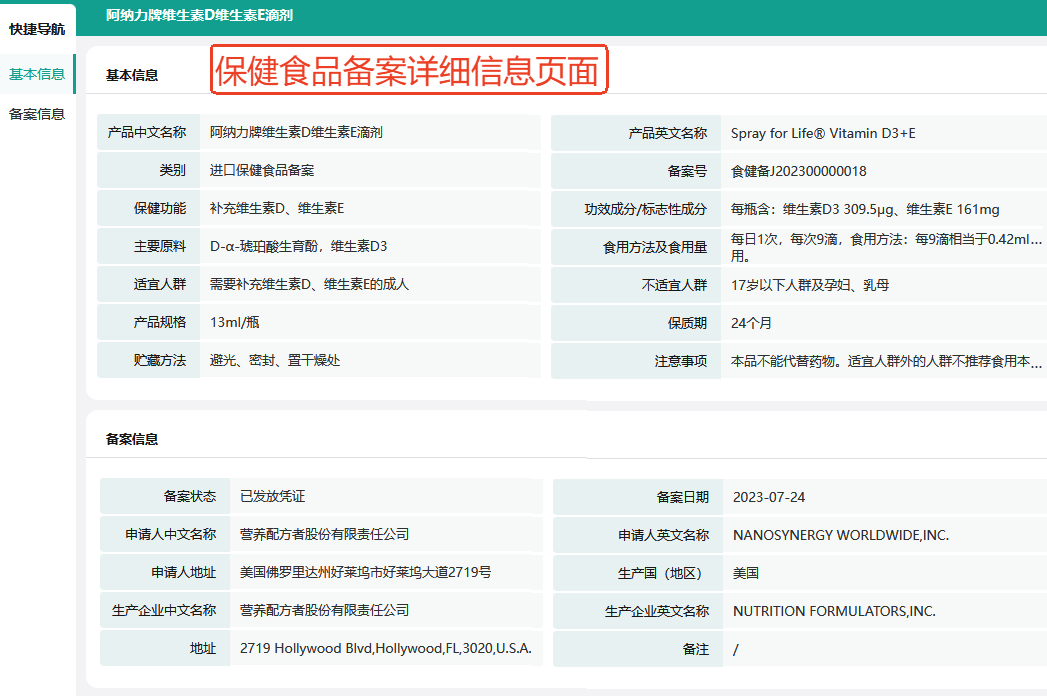 ⑤点击搜索结果中的“阿纳力牌维生素D维生素E滴剂”可查看该保健食品备案的详细信息。