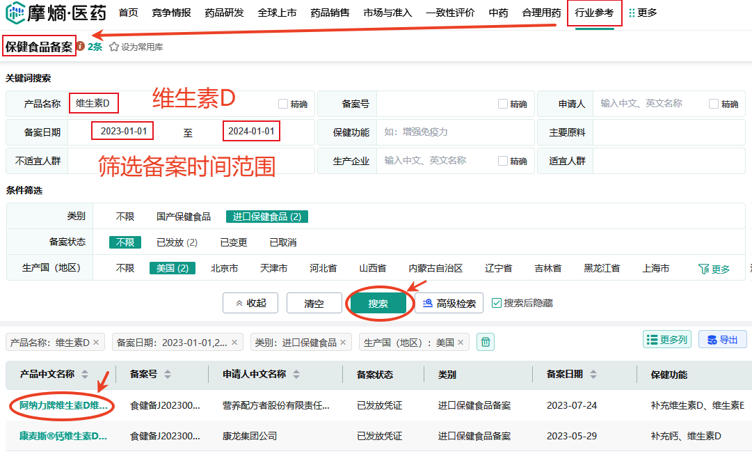 以查询2023年1月1日至2024年1月1日期间美国主要原料是维生素D的进口保健食品备案信息为例,如下图摩熵医药数据库的搜索界面
