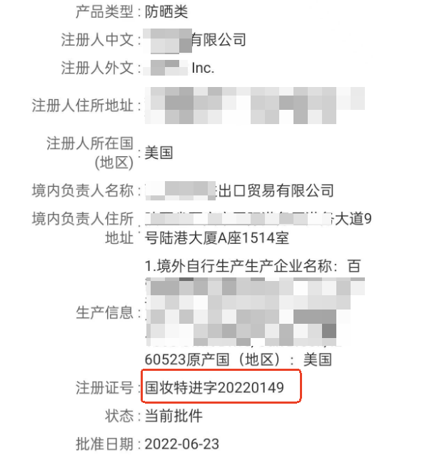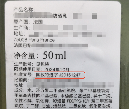 进口特殊化妆品编号格式为“国妆特进字+四位年份数+本年度注册产品顺序数”,例如“国妆特进字20230132”。