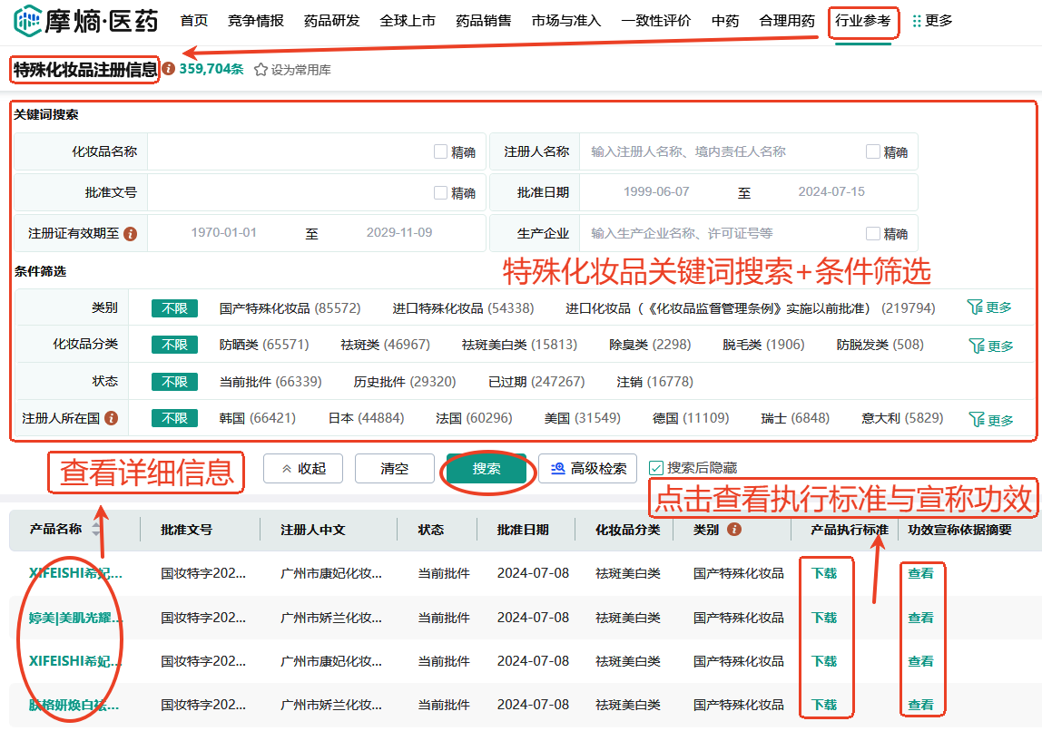 摩熵医药-化妆品数据库包含了特殊化妆品注册信息、化妆品生产企业、化妆品检验检测机构、化妆品新原料信息等数据库。以摩熵医药-特殊化妆品注册信息数据库为例,这个数据库收录35万余条特殊化妆品注册信息,整合国家药品监督管理局公布信息,提供更丰富的数据检索及下载方式。可通过化妆品名称、注册人名称、化妆品批准文号、化妆品分类、状态、注册人所在地区等多个字段查询详细信息,如配方成分、生产工艺、各类指标、检验方法、实用方法、储存条件、保质期等信息,便于行业企业数据洞察及下载分析,如下图。