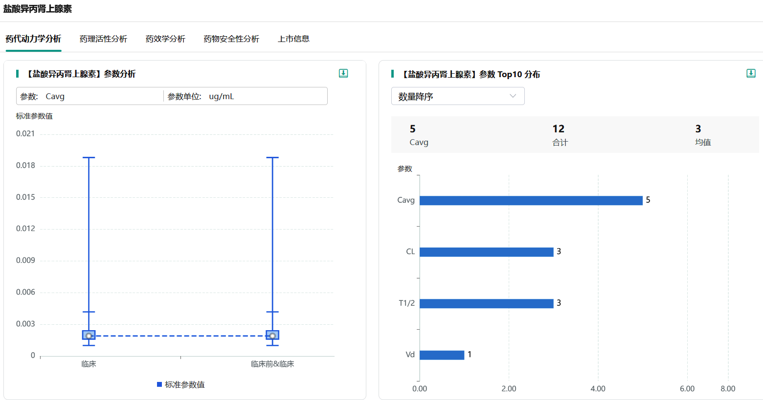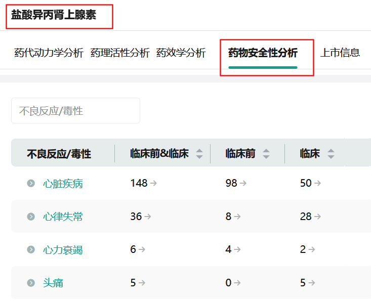 此外还可以通过该数据库的全局分析功能查看【盐酸异丙肾上腺素】参数分析、【盐酸异丙肾上腺素】参数Top分布、药物安全性分析、上市药物等信息。