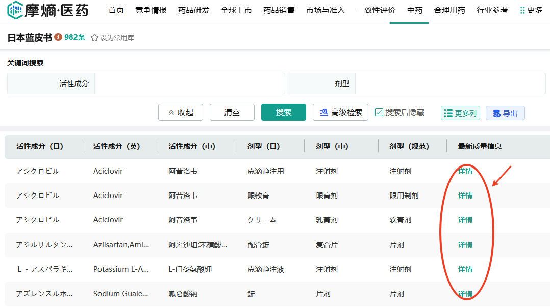 查询技巧:可结合摩熵医药-美国橙皮书免费查询参比制剂信息,实现中美数据交叉验证。
