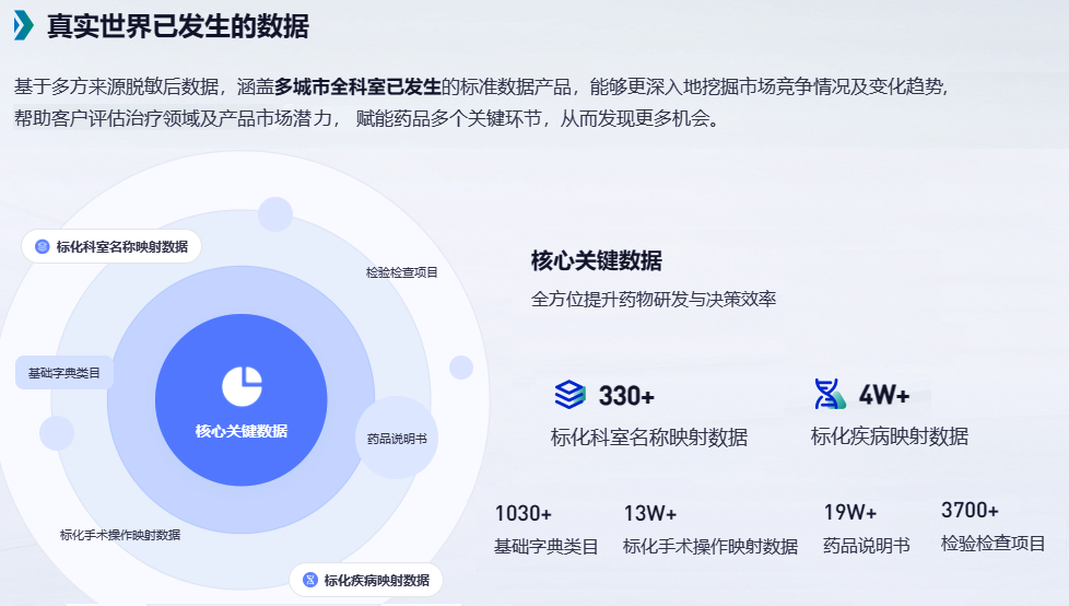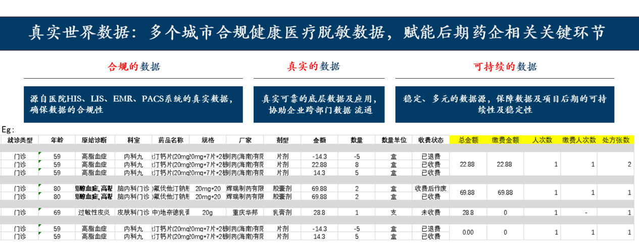 如摩熵医药的王博士提到,他们的摩熵医疗大数据是合规的、真实的、可持续的数据,拥有多方权威来源;包括但不限于医院管理信息系统(HIS系统),比如就诊信息、科室名称、科室处方、处方信息、检查信息、门诊挂号、处方信息等;以及医院检验科信息管理系统(LIS)、电子病历(EMR)、医疗影像PACS系统等其他数据,比如检验报告单、检验报告单明细、药敏记录、细菌培养、入院记录、出院记录、首日病程等权威脱敏数据。