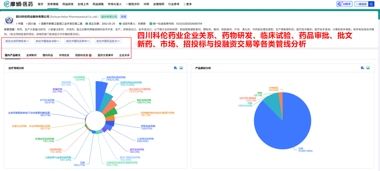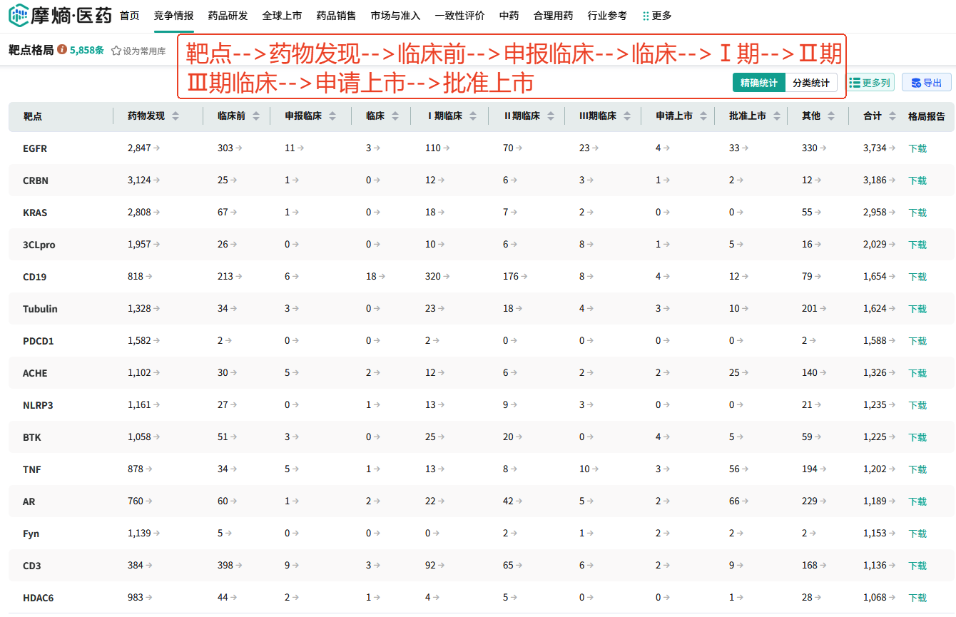 其核心目标是系统性管理新药从早期发现到商业化的全流程,以平衡风险、提高成功率并确保持续创新。下面以医药行业常用调研工具(摩熵医药数据库)为例,展示各研发管线的关键解析: