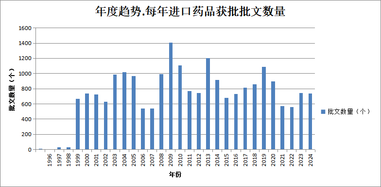 根据摩熵医药数据库统计,在2016年至2019年间,中国每年进口药品批文数量呈增长趋势,在2020至2022年间呈递减趋势,而到了2023年至2024年,中国每年进口药品批文数量基本维持在740个左右。可以看出,在进口药引进的数量上近5年相较于前5年有一定数量的下降,但波动值正常。