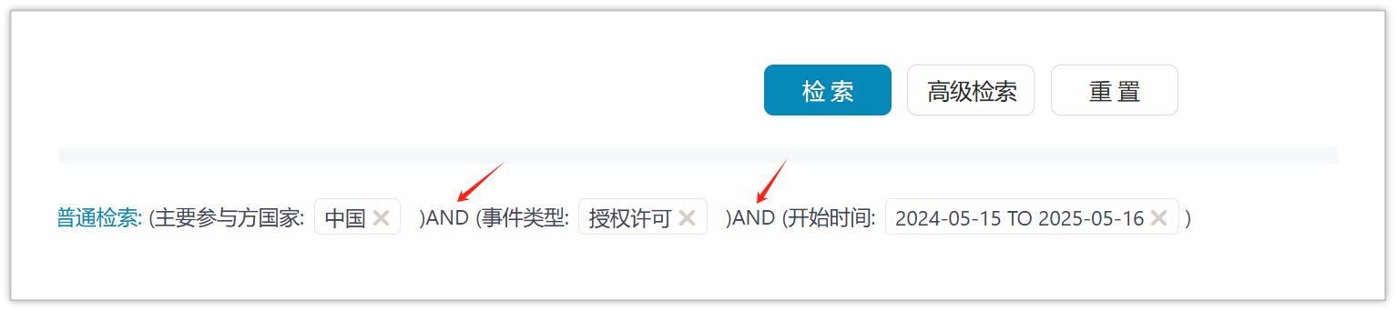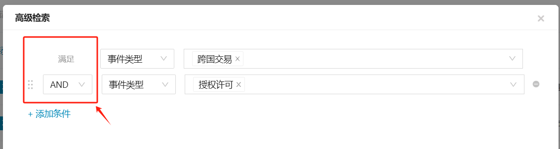 我们观察到这两个条件都在“事件类型”中,直接选这两个条件然后点检索出来的会是跨国交易或授权许可的交易,而不是同时满足这两个条件的交易。此时我们需要用到高级检索去调整两个条件的逻辑连接。