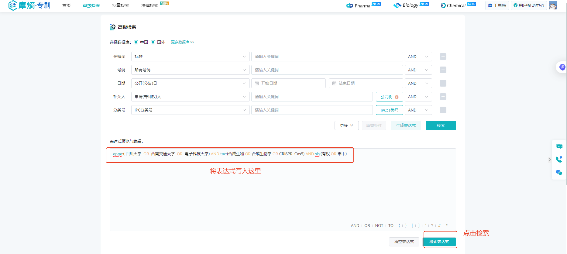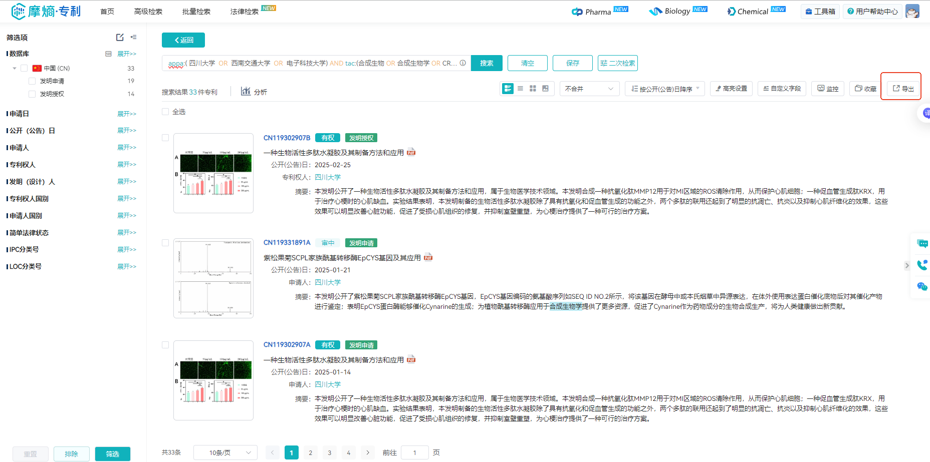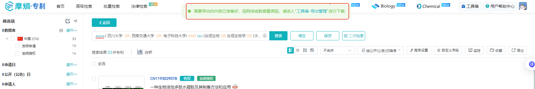 因为我还是摸索了一下专利数据库的用法,所以下面我详细介绍一下如何使用DeePat查询四川省内高校合成生物学相关专利及法律状态情况,希望帮助和我一样的师兄弟姐妹快速上手:
