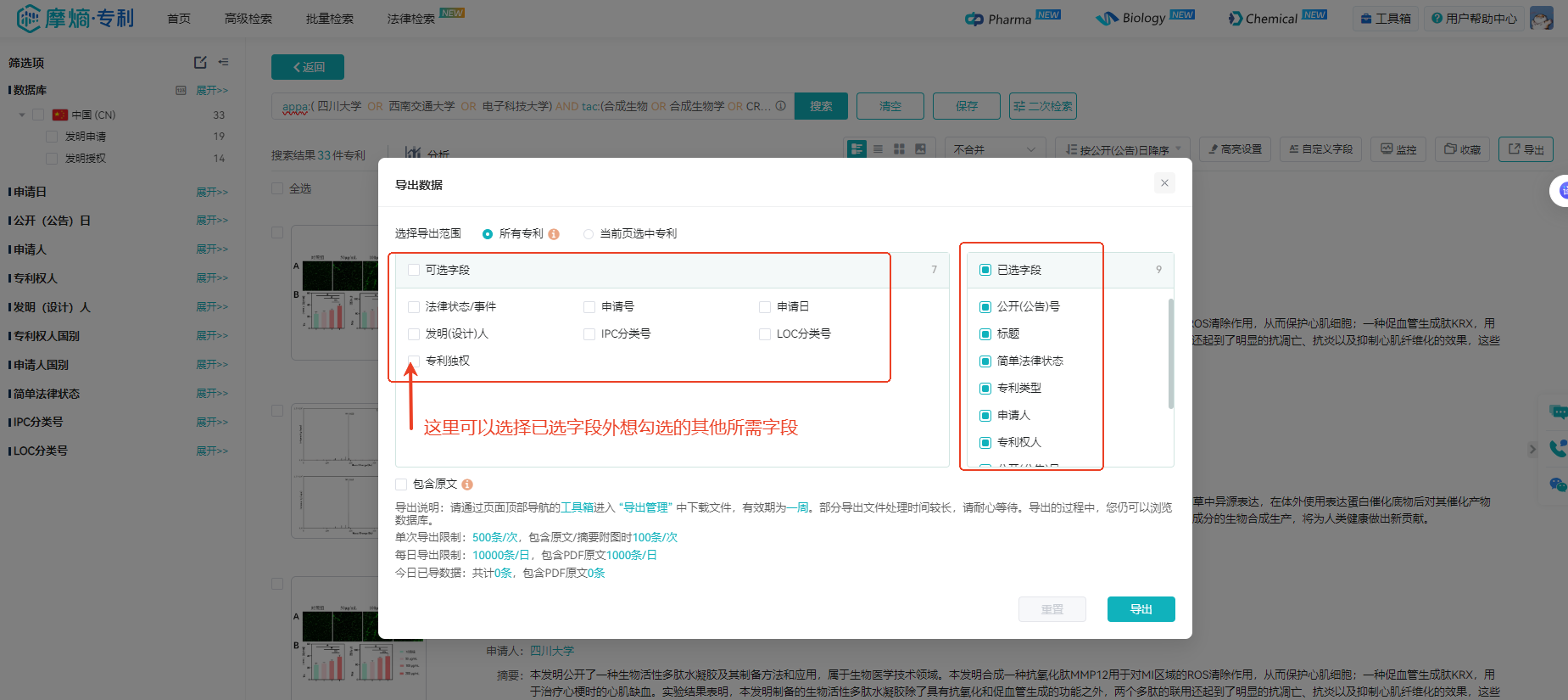 若想导出excel表格,上图中点击导出,下图中选择目标字段。