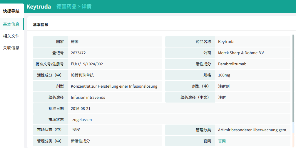 点击绿色字体的药品名称,即可进入该德国药品的基本信息、药品说明书等文件以及该药品的拓展关联信息(如下图)
