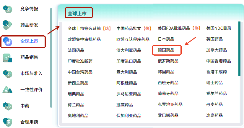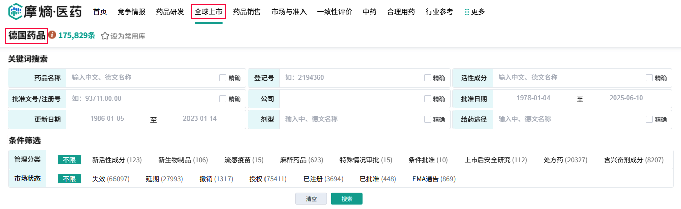 查询路径:进入摩熵医药官网→进入全球上市数据→选择德国药品数据库