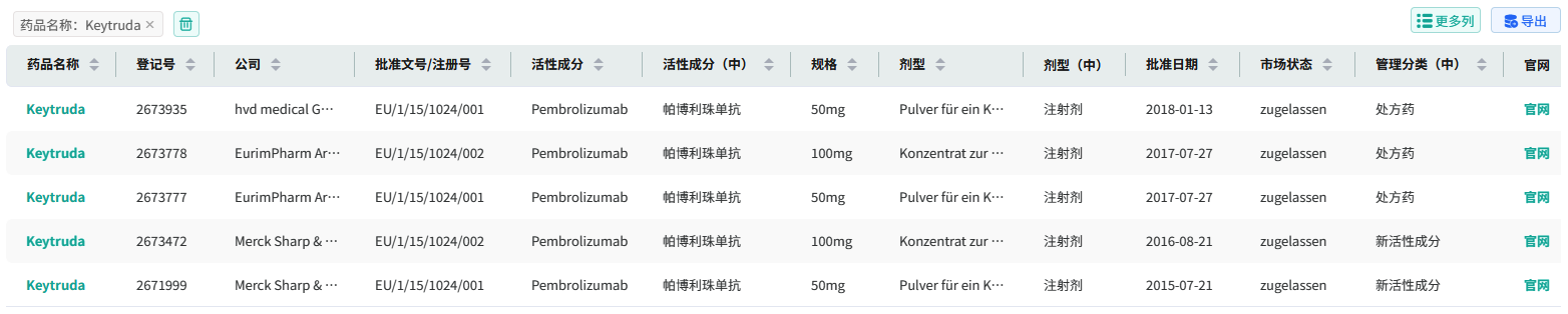 以查看德国药品‘Keytruda(帕博利珠单抗)’为例,在其德国药品数据库中搜索‘Keytruda’,可以看到该药品的全部检索结果(如下图)