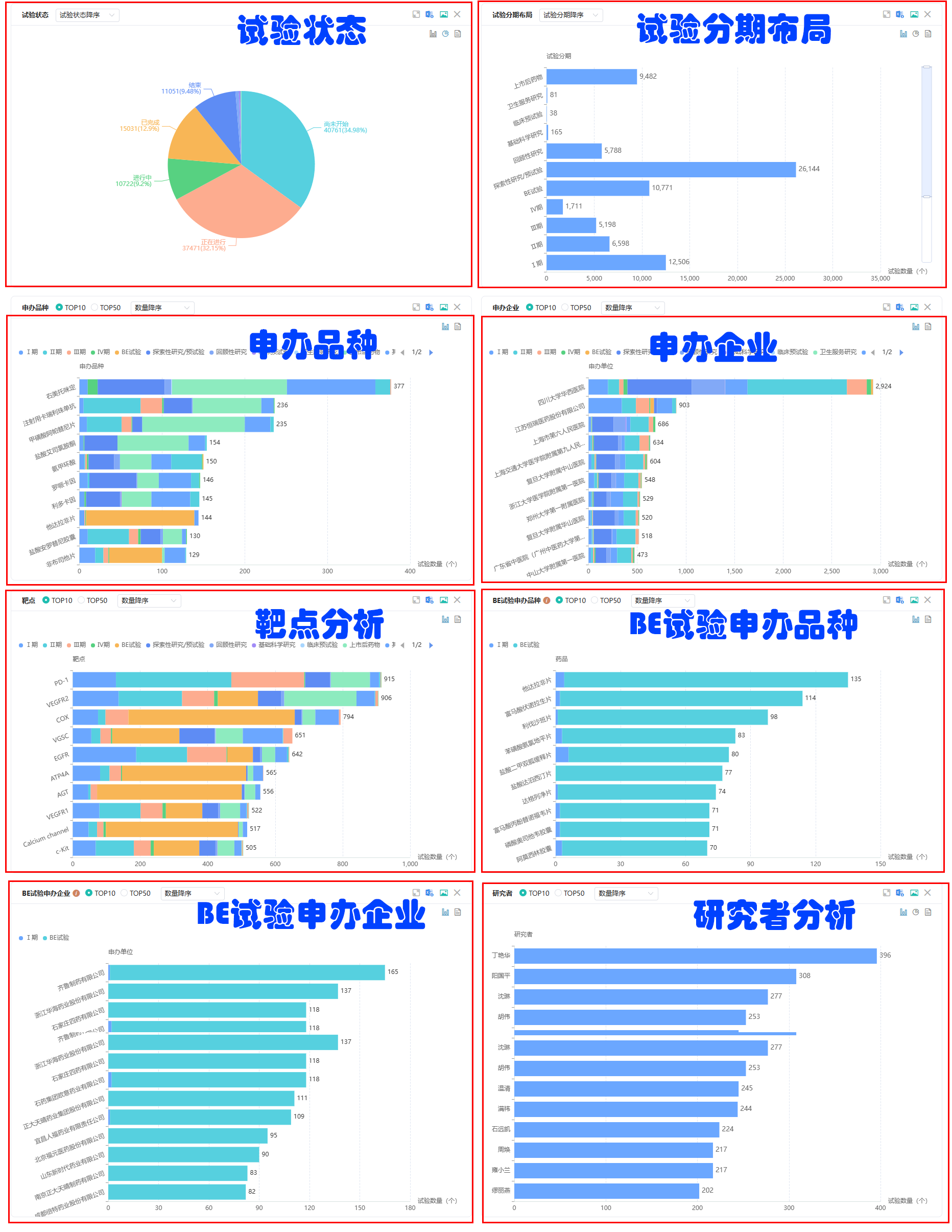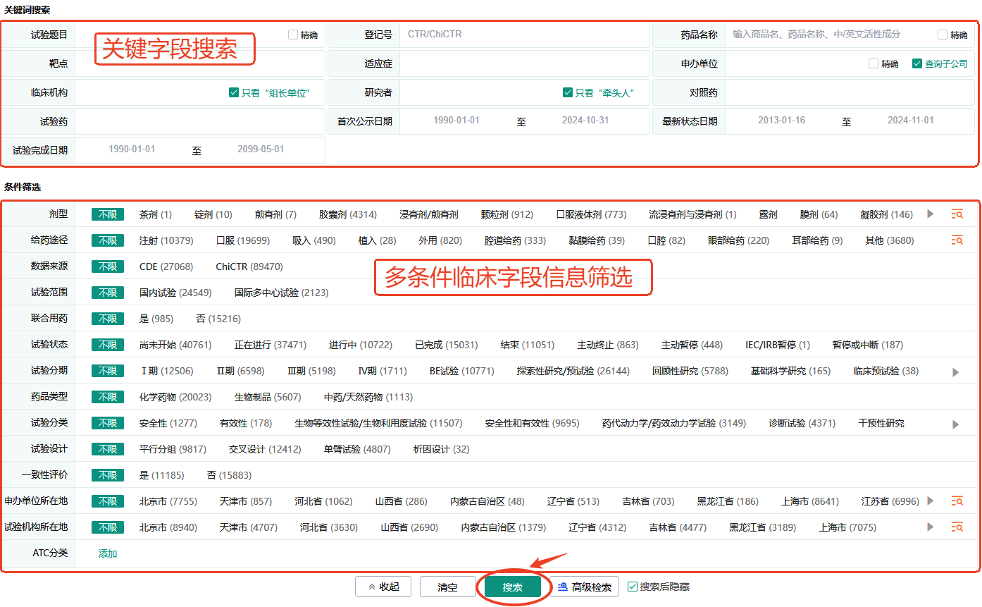 临床试验查询:通过试验题目、登记号、药品名称、靶点、试验日期、适应症、申办单位(含子公司)、临床机构、研究者、对照药、试验药、公示日期等搜索栏,快速定位目标信息。