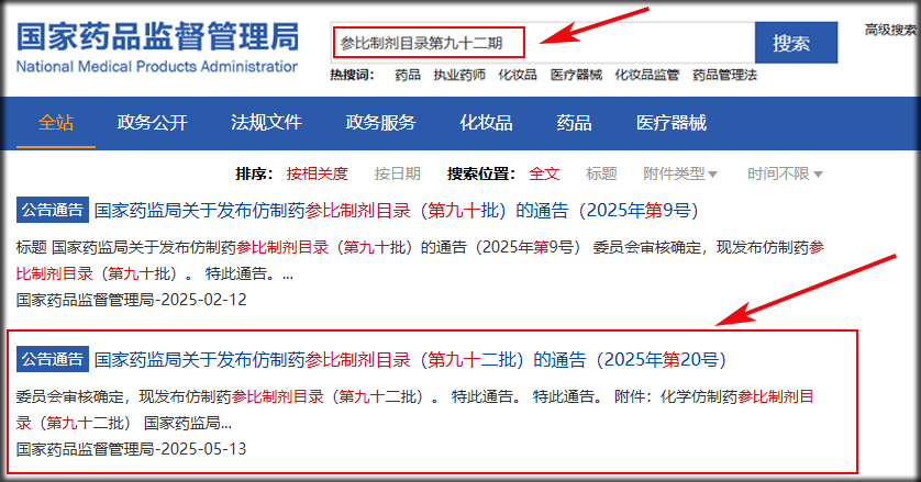 ①在NMPA官网中,仿制药参比制剂目录主要通过文件公告的形式发布,如2025-05-13最新发布的第九十二批仿制药参比制剂目录,可以直接进入官网主页搜索框搜索’参比制剂目录第九十二批’点击即可下载其目录文档。