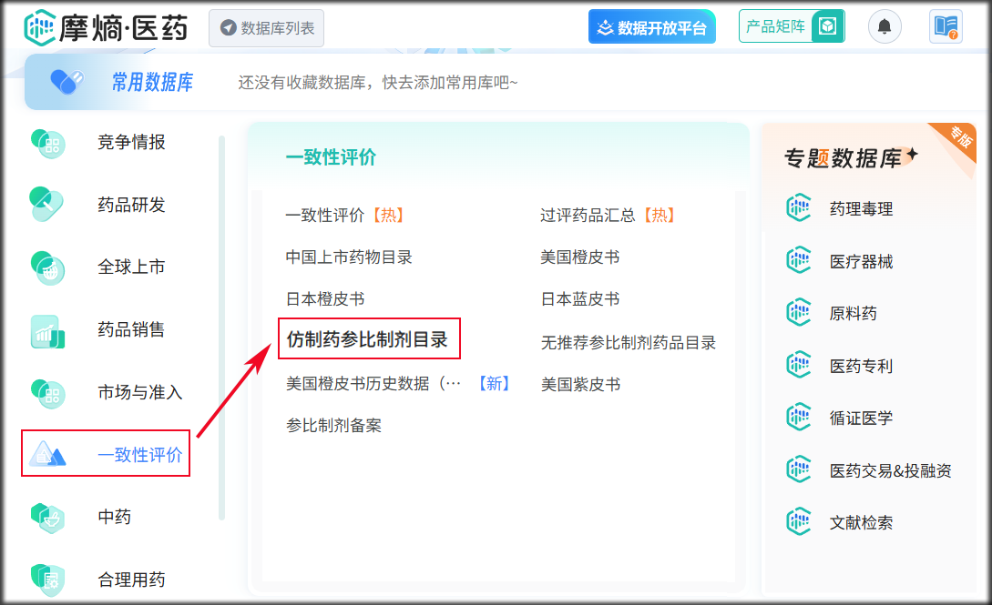 访问摩熵医药官网→进入数据库→选择一'致性评价'