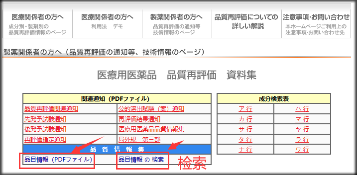 →选择'品目情报'or'品目情报检索'(这两个选项均可帮助用户查找具体的药品信息,其中“品目情报检索”通常提供更为高级的搜索功能,允许用户通过关键词、药品名称等进行精准搜索),进入日本橙皮书数据库搜索界面(固体口服仿制药参比制剂目录)