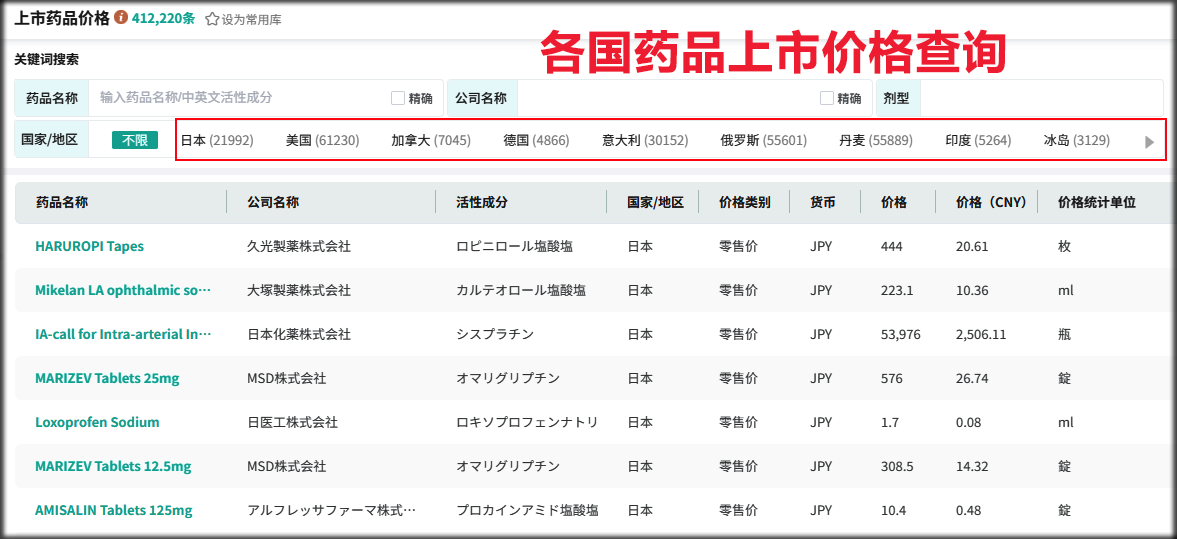 最后一个是摩熵医药的上市药品价格数据库,其收录美国、日本、加拿大等全球十多个国家上市药品价格,包含药品上市基本信息和零售价、最高零售价、出厂价、平均采购价等,可结合价格统计单位查看包装价格或者最小制剂单位价格。 数据来源于各国药品定价相关官网: 如:意大利AIFA药品报销目录、俄罗斯GRLS药品价格目录、美国medicaid的NADAC(全国平均药品采购成本价格)、加拿大New Brunswick报销药品价格目录和定价政策、日本社会保险医疗协议会的医药品药价收载、德国BfArM 药品参考定价。