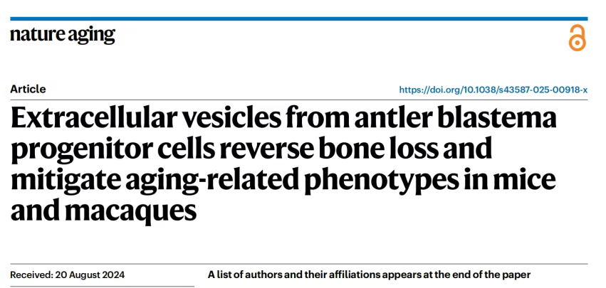2.Hao, Y., Yu, B., Qin, M. et al. Extracellular vesicles from antler blastema progenitor cells reverse bone loss and mitigate aging-related phenotypes in mice and macaques. Nat Aging (2025). https://doi.org/10.1038/s43587-025-00918-x