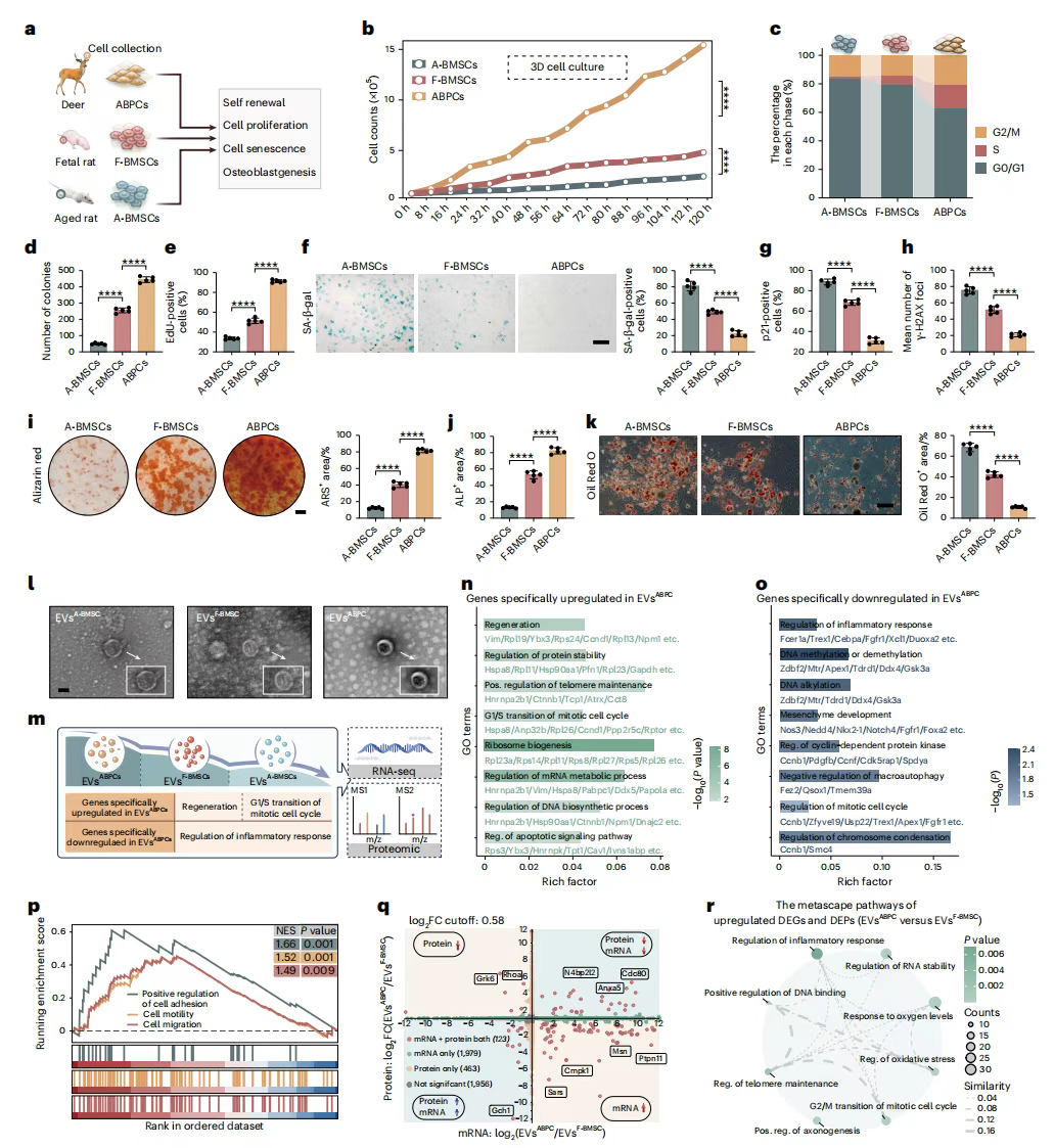 并且,ABPCs 的“战斗力”也远超普通干细胞:其自我更新能力和集落形成效率远超鹿角中的其他干细胞群,能支撑数月的快速生长。由其衍生的鹿角干细胞(ASCs),增殖能力远高于人类骨髓干细胞(hBMSCs)。更重要的是,ASCs 分泌的外泌体已被证实能促进 hBMSCs 增殖、减轻细胞衰老——这意味着,ASCs 可以通过外泌体将再生潜力传递给其他细胞,为诱导干细胞再生提供了新途径。