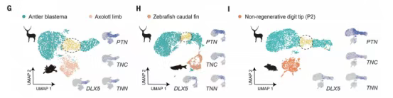 通过单细胞测序技术对梅花鹿鹿角再生过程进行分析,他们识别出了一种特殊的细胞群——鹿角芽基祖细胞(ABPCs),正是这些细胞驱动着鹿角的再生周期。它们会形成一种“芽基样”结构,类似两栖动物肢体再生时的未分化细胞团。研究还发现,与蝾螈等低等动物不同,鹿角的这种芽基样结构直接来源于表达 PRRX1 基因的间充质干细胞,这些干细胞会进一步分化为 ABPCs。