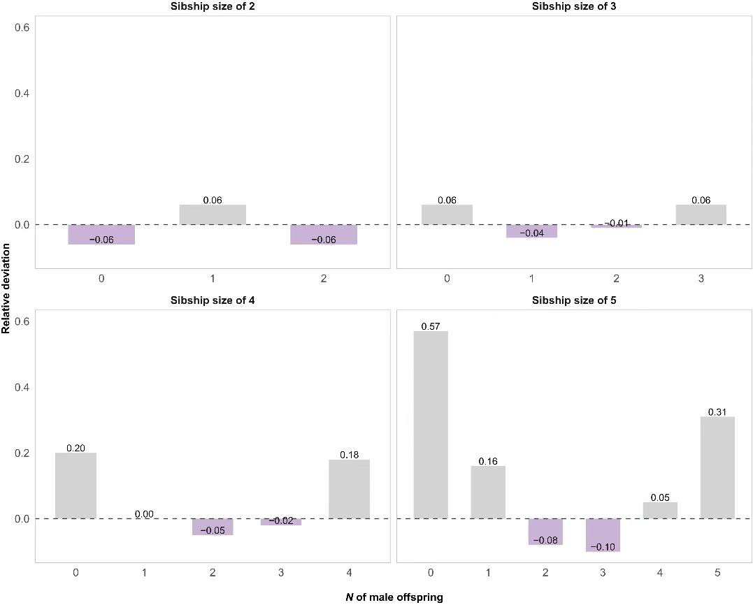 图1:后代性别分布与兄弟姐妹规模二项式期望的相对偏差
