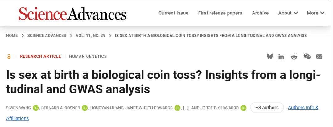 Wang S, Rosner BA, Huang H, et al. Is sex at birth a biological coin toss? Insights from a longitudinal and GWAS analysis. Sci Adv. 2025;11(29):eadu7402. doi:10.1126/sciadv.adu7402