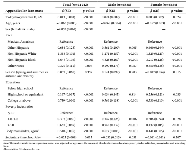 这些数据表明,无论是在全体样本还是在性别分层分析中,血清25(OH)D水平越高,四肢骨骼肌质量也随之增加。