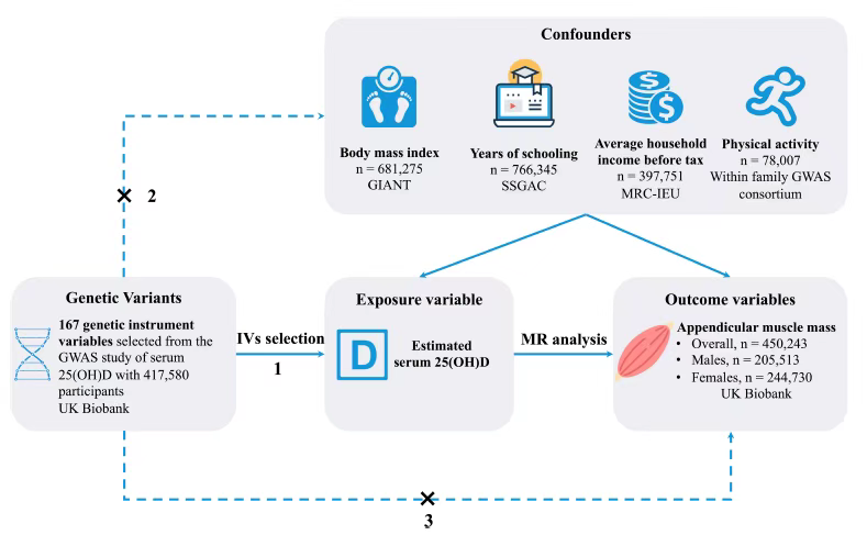 选取了167个已在GWAS中确认与维生素D水平显著相关的基因位点(SNPs)作为工具变量,评估这类“基因层面上更高维生素D”人群的四肢肌肉量(AMM)变化。样本来自英国生物库,共计417,580名欧洲人群。