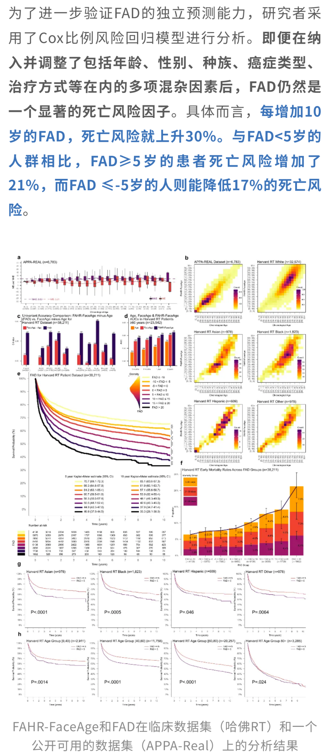 在评估FAHR-FaceAge模型的临床应用价值时,研究人员提出了一个核心概念:FAD(FAHR-FaceAge Deviation),即AI所预测的生物年龄与个体实际年龄之间的差值。这个看似简单的指标,却在一项涉及38,211名癌症患者的大型临床队列中,揭示出了深远的健康意义。
