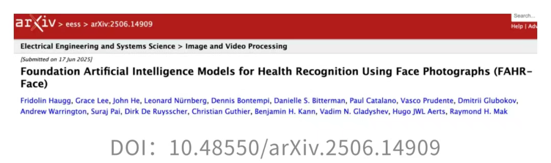 Haugg, Fridolin, et al. Foundation Artificial Intelligence Models for Health Recognition Using Face Photographs (FAHR-Face). arXiv:2506.14909, arXiv, 17 June 2025. arXiv.org, https://doi.org/10.48550/arXiv.2506.14909