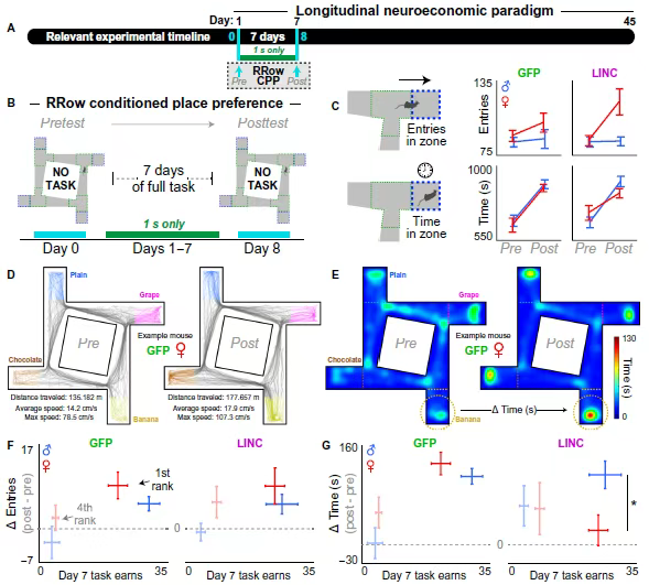 随后,为了探究 LINC00473 对奖励相关行为的影响,研究人员设计了无任务的自由探索实验:让小鼠在没有任何任务的情况下自由逛迷宫,观察它们对曾经获取奖励的位点(即不同风味的餐厅)形成的条件性位置偏好(CPP)——简单说,就是看小鼠是否会更频繁、更久地停留在自己喜欢的奖励位点附近。他们发现,尽管雌性小鼠获取的奖励数量和雄性相当,但在它们最偏好的风味区域,停留时间的增加幅度明显变弱(也就是 CPP 减弱),而进入这些区域的频率却没受影响。